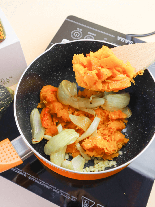③ 鍋中加入少許橄欖油,倒入蒜末拌炒,而後把烤熟去皮的南瓜、洋蔥加入鍋中。