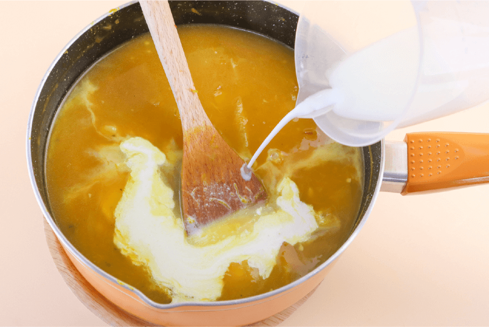 ➋ 濃湯加入牛奶後,可小火攪拌,不要大滾,避免油水分離。