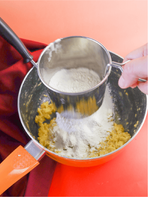 ② 花粉放於袋裝壓碎,並依序加入花粉/糖粉並攪拌均勻。