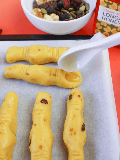 ⑥ 將麵團分小份,每份約20g。⑦ 開始塑形捏出手指,並用杏仁作為指甲,指甲的黏著劑使用蜂蜜。