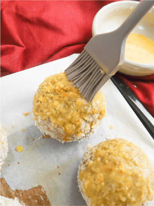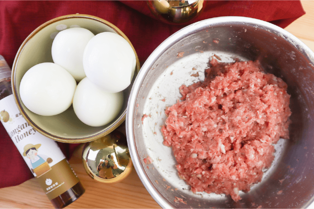 ③ 肉球:抓起一坨絞肉,鋪平包上水煮雞蛋,並搓捏成圓球狀。
