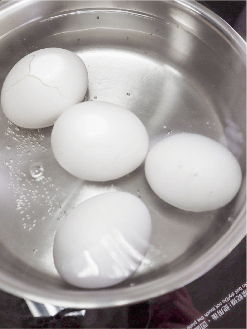 ① 煮雞蛋,雞蛋煮6-8分鐘後,過冷水,並將蛋殼剝掉備用。