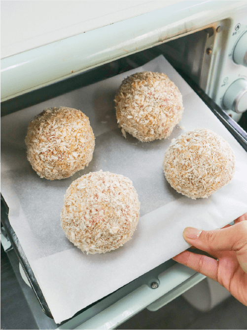 ④ 裹粉:先將肉球裹上 麵粉→雞蛋液→麵包粉。