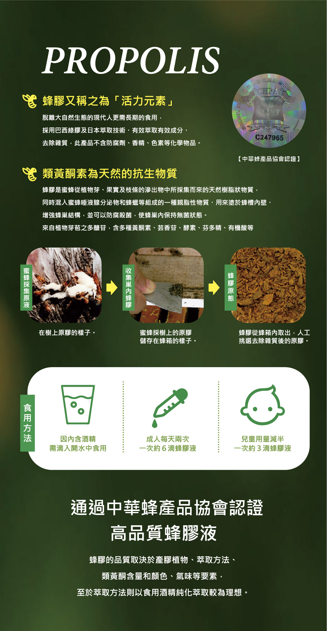 我們的蜂膠採用優質巴西綠膠,引用先進的日本萃取技術,去除多餘雜質並萃取出高純度的天然黃酮類成分,敬請安心食用。