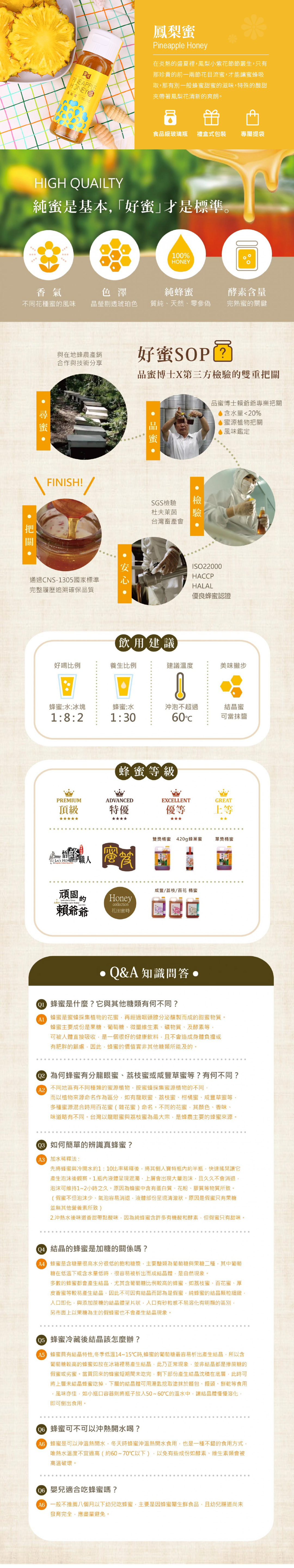 ●品名:蜜笈 鳳梨蜜《易結晶》●容量:420g/瓶●成分:蜂蜜●原產地:台灣●保存期限:二年●保存方法:常溫不宜冷藏、曝曬,請放置陰涼處存放,避免碰到水。●使用方法:可以冷、溫開水泡開,再加冰塊、果片。可和牛奶、咖啡調和或當抹醬、沾醬或調理。 ●注意事項:1.八個月以下幼兒不宜飲用。2.不與生石膏類食品、生甲殼魚類、生蠔類同食(間隔二小時)。3.蜂蜜為農產品,每批品質會隨氣候與環境而有所異。4.結晶乃晶種自然轉化,可放心使用。