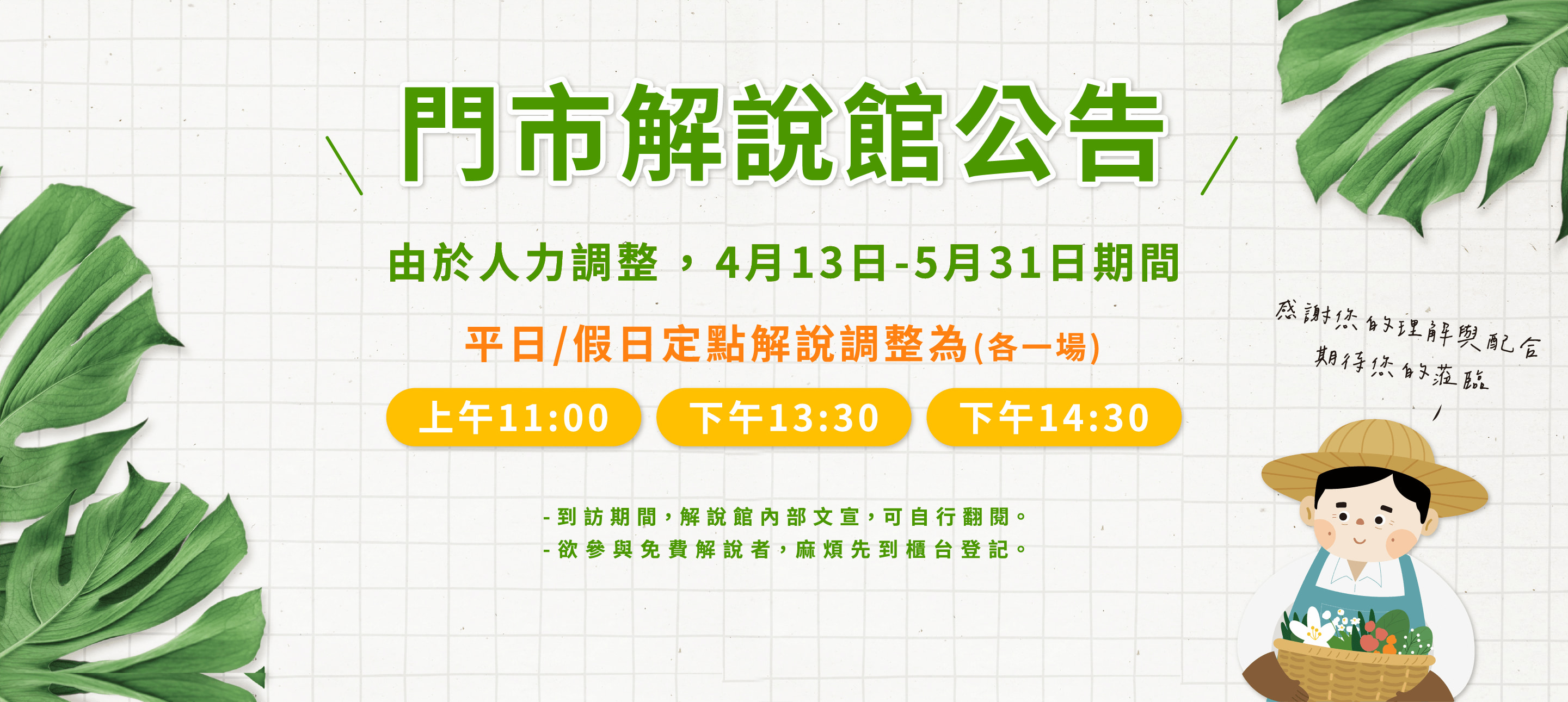 解說館 由於人力調整2026年4月13日~5月31日 平日/假日定點解說→11:00...