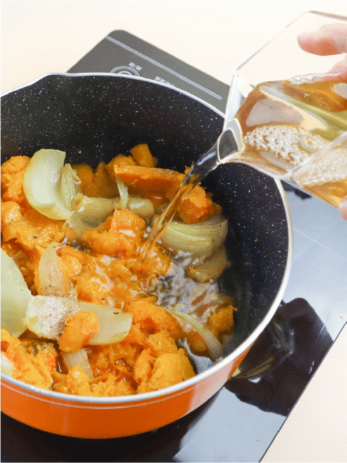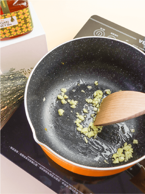 ③ 鍋中加入少許橄欖油,倒入蒜末拌炒,而後把烤熟去皮的南瓜、洋蔥加入鍋中。