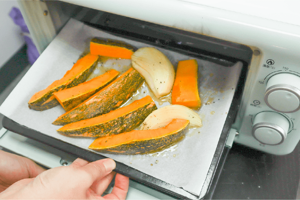 ① 南瓜切塊、洋蔥切半,撒上鹽巴、黑胡椒粒、橄欖油、蜂蜜,進入烤箱,烤25分鐘,而後翻面再烤25分鐘。