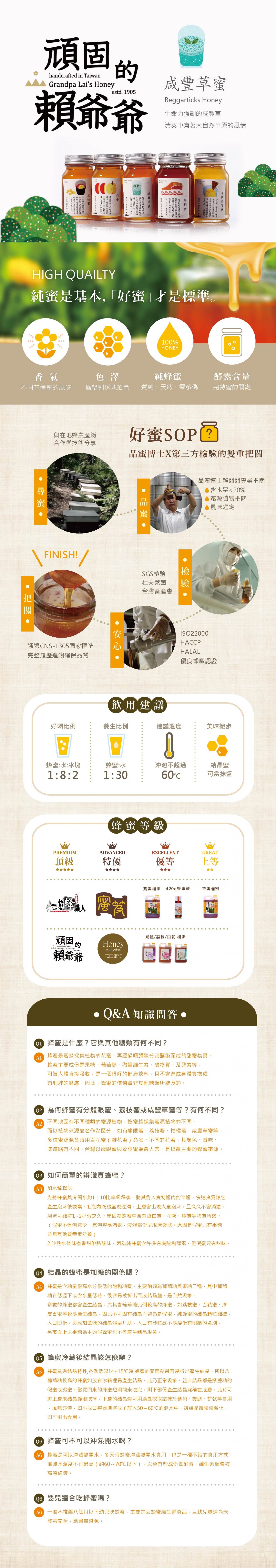 ●品名:頑固的賴爺爺 咸豐草蜜 《易結晶》●容量:120g/瓶●成分:蜂蜜●原產地:台灣●保存期限:二年●保存方法:常溫不宜冷藏、曝曬,請放置陰涼處存放,避免碰到水。●使用方法:可以冷、溫開水泡開,再加冰塊、果片。可和牛奶、咖啡調和或當抹醬、沾醬或調理。 ●注意事項:1.八個月以下幼兒不宜飲用。2.不與生石膏類食品、生甲殼魚類、生蠔類同食(間隔二小時)。3.蜂蜜為農產品,每批品質會隨氣候與環境而有所異。4.結晶乃晶種自然轉化,可寬心使用。