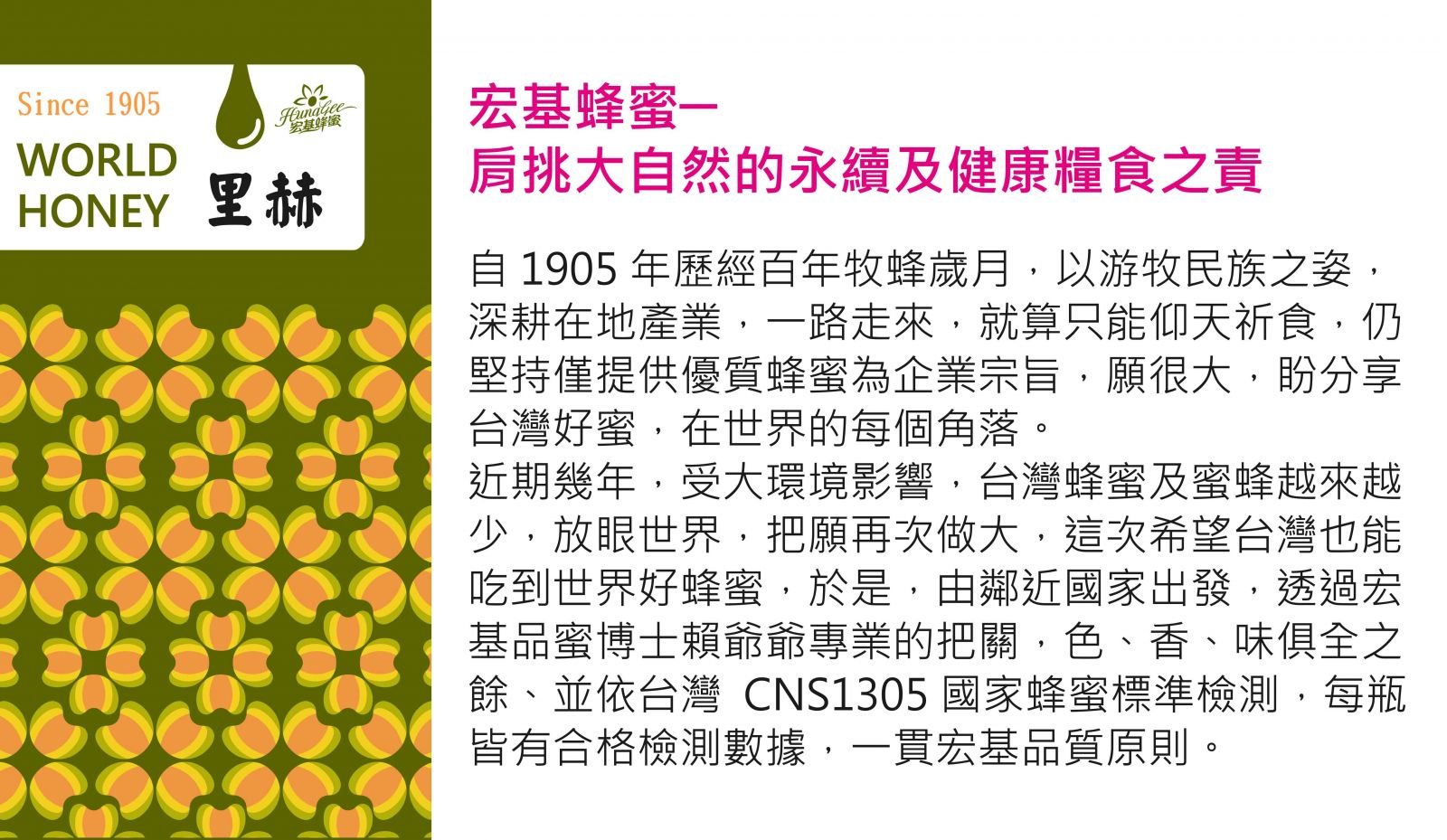近年來,受大環境影響,台灣蜜源逐漸減少,因此宏基放眼海外,尋找品質優良的穩定蜂蜜來源。
