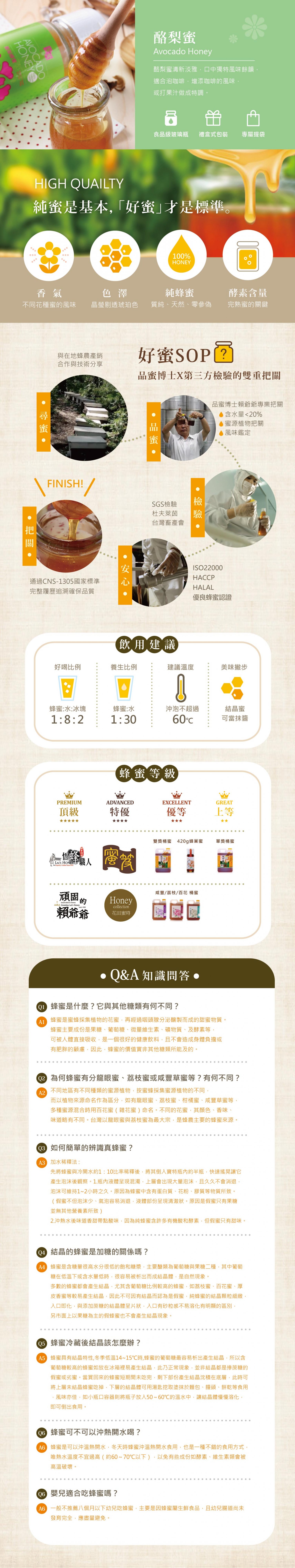 ●品名:蜜笈 酪梨蜂蜜《易結晶》●容量:700g/瓶●成分:蜂蜜●原產地:台灣●保存期限:二年●保存方法:常溫不宜冷藏、曝曬,請放置陰涼處存放,避免碰到水。●使用方法:可以冷、溫開水泡開,再加冰塊、果片。可和牛奶、咖啡調和或當抹醬、沾醬或調理。 ●注意事項:1.八個月以下幼兒不宜飲用。2.不與生石膏類食品、生甲殼魚類、生蠔類同食(間隔二小時)。3.蜂蜜為農產品,每批品質會隨氣候與環境而有所異。4.結晶乃晶種自然轉化,可寬心使用。